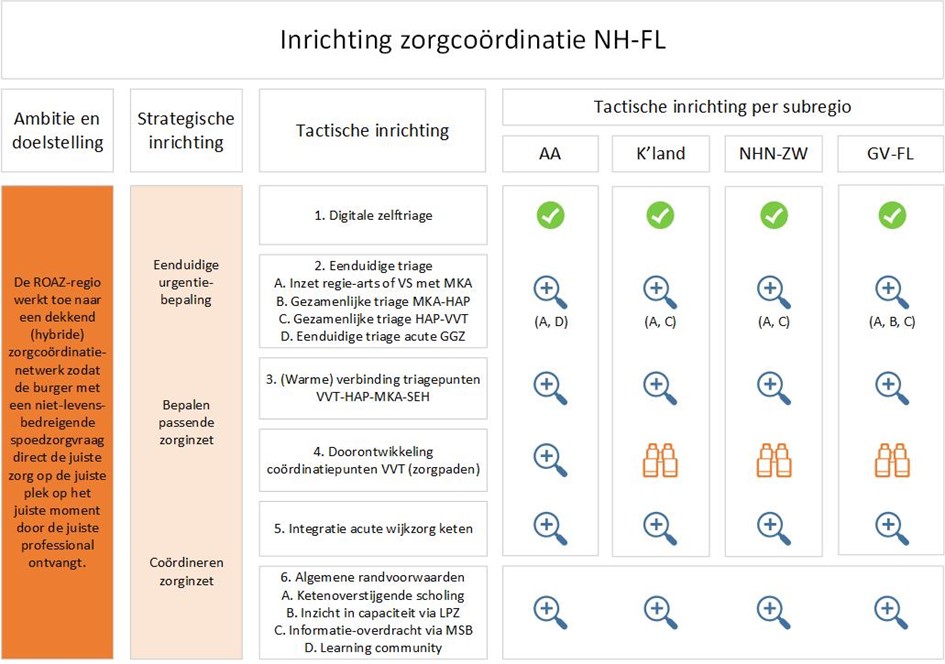 In vier subregio’s wordt, in opdracht van het ROAZ-bestuur gewerkt aan zorgcoördinatie. Met in elke subregio een eigen projectleider. Ketenpartners, adviseurs van het ROAZ-bureau en de projectleiders stellen gezamenlijk de IZA-aanvraag op conform de visie van het ROAZ Noord-Holland/Flevoland (NH/FL). De 4 subregio’s werken de komende jaren aan een doorontwikkeling van de bestaande triage- en coördinatiepunten middels 5 gezamenlijke tactische oplossingslijnen (zie afbeelding). Dit vormt de basis voor een dekkend zorgcoördinatienetwerk rond 2030, zodat inwoners en bezoekers van de regio NH/FL met een niet-levensbedreigende spoedzorgvraag snel de juiste zorg ontvangen. Het proces is experimenteel en verloopt stapsgewijs. In deze fase werken we omwille van haalbaarheid én risico’s (nog) niet richting één fysieke zorgcoördinatievoorziening.