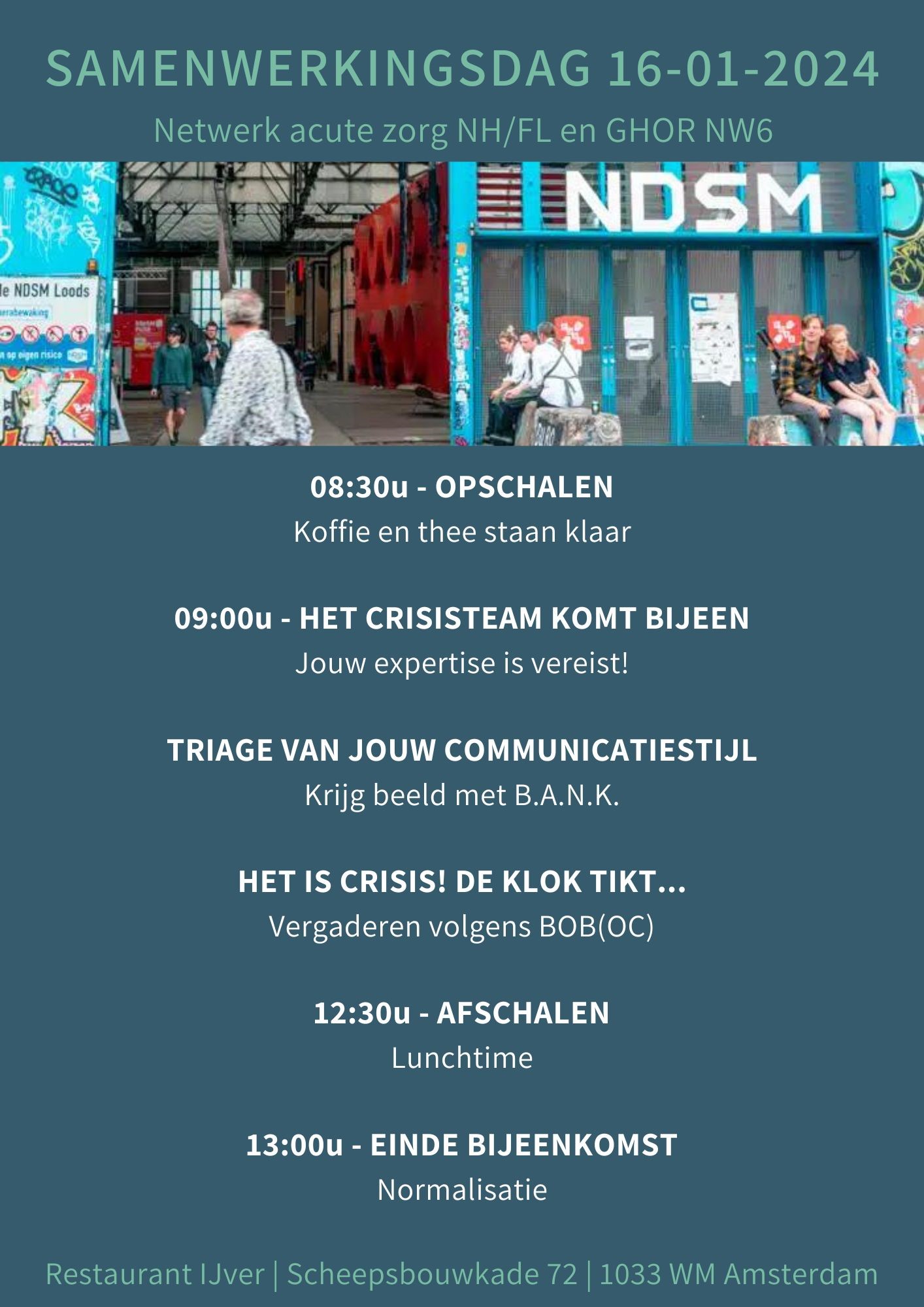 Deze ochtend staat in het teken van samenwerking tussen de GHOR-bureaus (Amsterdam-Amstelland, Noord-Holland-Noord, Zaanstreek-Waterland, Flevoland & Gooi- en Vechtstreek en Kennemerland) onderling en het Netwerk Acute Zorg NH/Fl. Met andere woorden: hoe kunnen we gezamenlijk meer optrekken, de verschillende zorginstellingen (beter) bedienen en waar kunnen we van elkaar leren en elkaar sterker maken. Dit alles om de veerkracht van de totale zorgketen te bevorderen.
