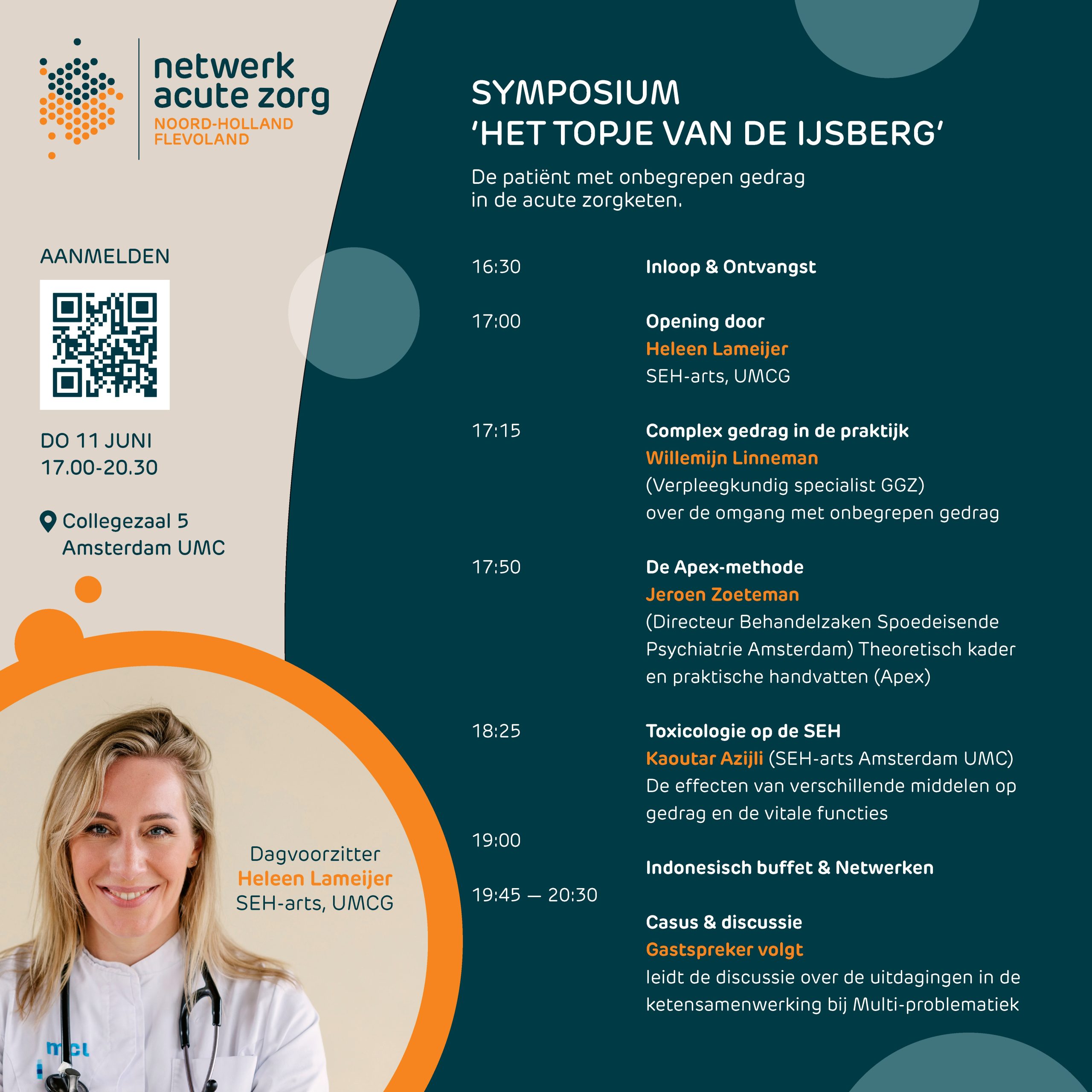 Onze dagvoorzitter is Heleen Lameijer, SEH-arts in het UMCG en auteur van meerdere boeken over de spoedeisende hulp. Zij verbindt praktijkervaring, medische kennis en persoonlijke verhalen op een manier die aansluit bij elke zorgprofessional.