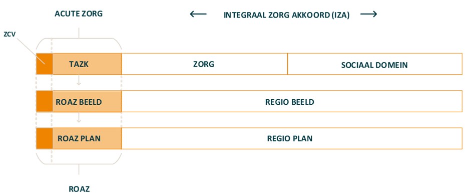 De regiobeelden en plannen zijn opgesteld vanuit het IZA en omvatten het volledige domein zorg & welzijn. Ook voor de regioplannen geld een regio-indeling. Die komt overeen met de zorgkantoorregio’s. De regioplannen en ROAZ-plannen overlappen op sommige punten. Daarom is nauwe samenwerking en afstemming tussen de verschillende plannen en projecten essentieel om dubbelen te voorkomen en optimale samenwerking te bewerkstelligen.
